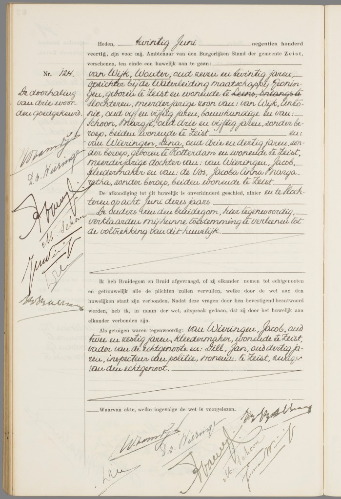 Antonie van Wijk (geboren in Aalburg) en Margje Schoon ( geboren in Zuidlaren) treden op 9 mei 1912 in het huwelijk in Zeist.