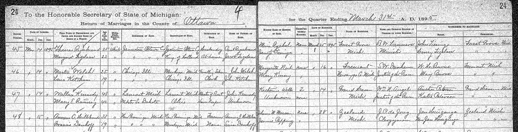 Zoon Anneus C. trouwt op 28 maart 1895 in Zeeland, Michigan met Francis Danhoff (zie laatste regel).