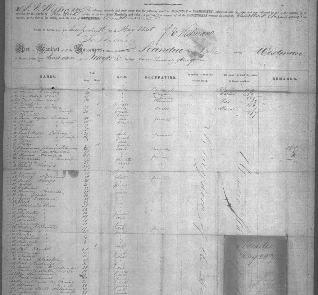 Het echtpaar is op 9 mei 1848 vertrokken vanaf Amsterdam met de Scandia, een bark met 3, 4 of 5 masten. Aan boord waren ook het gezin T. van den Bosch, B. Kamps, E. Evers, Diekema, Schepers, R. ten Hake, H. Vredevelt, H. Pijl, B.J. Poes, E. Eding en de weduwe Essing, allen uit Drenthe.
