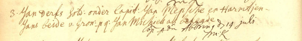 10 juni 1693 3. Jan Derks sold: onder Capit: Jan Mepsche en Harmtjen Jans beide van Gron: pq: Jan Michiels als bekende. Cop [getrouwd] A de Abbing d. 14 juli M:K [Martini Kerk]