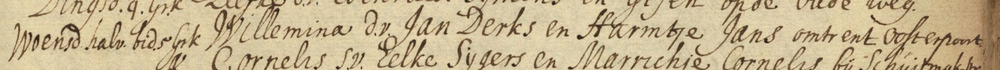 Woensd. halv. bid 5 GrK Willemina d.v. Jan Derks en Harmtje Jans omtrent Oosterpoort [04-12-1694]