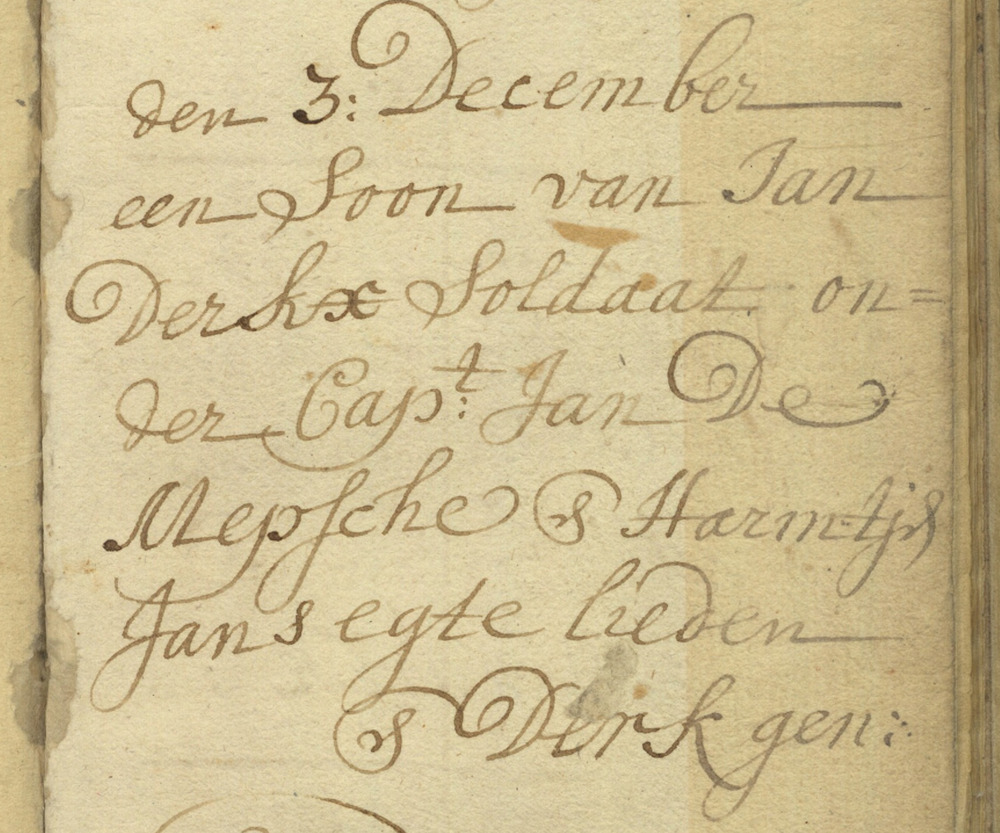 den 3: December een Soon van Jan Derkx Soldaat onder Capt: Jan De Mepsche & Harmttjen Jans egtelieden Derk gen: [03-12-1699]