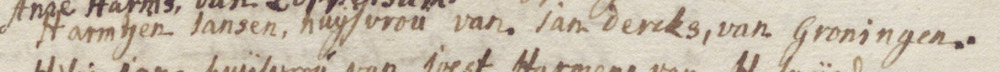 Harmtjen Jansen, huysvrou van Jan Derks, van Groningen.