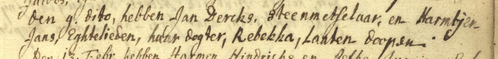 Den 9. dito, hebben Jan Derks, steenmetselaar, en Harmtjen Jans, Eghtelieden, haar dogter, Rebekka, laaten doopen [09-02-1707]