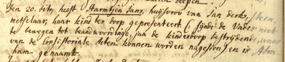 Den 20. dito, heeft Harmtjen Jans, huijsvrou van Jan Derks, steenmetselaar, haar kind ter doopt gepresenteert. (:sijnde de Vader niet van de Consistoriale Acten konnen worden nagesien) en is Abraham genaamt. [20-03-1709]