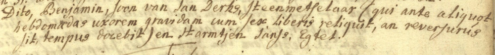 Dito, Benjamin, soon van Jan Derks, steenmetselaar (qui ante aliquot hebdomas uxorem gravidam cum sex liberis reliquit, an reversurus lit tempus docebit1) en Harmtjen Janss, Egtel. [31-01-1712]
