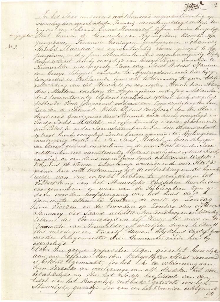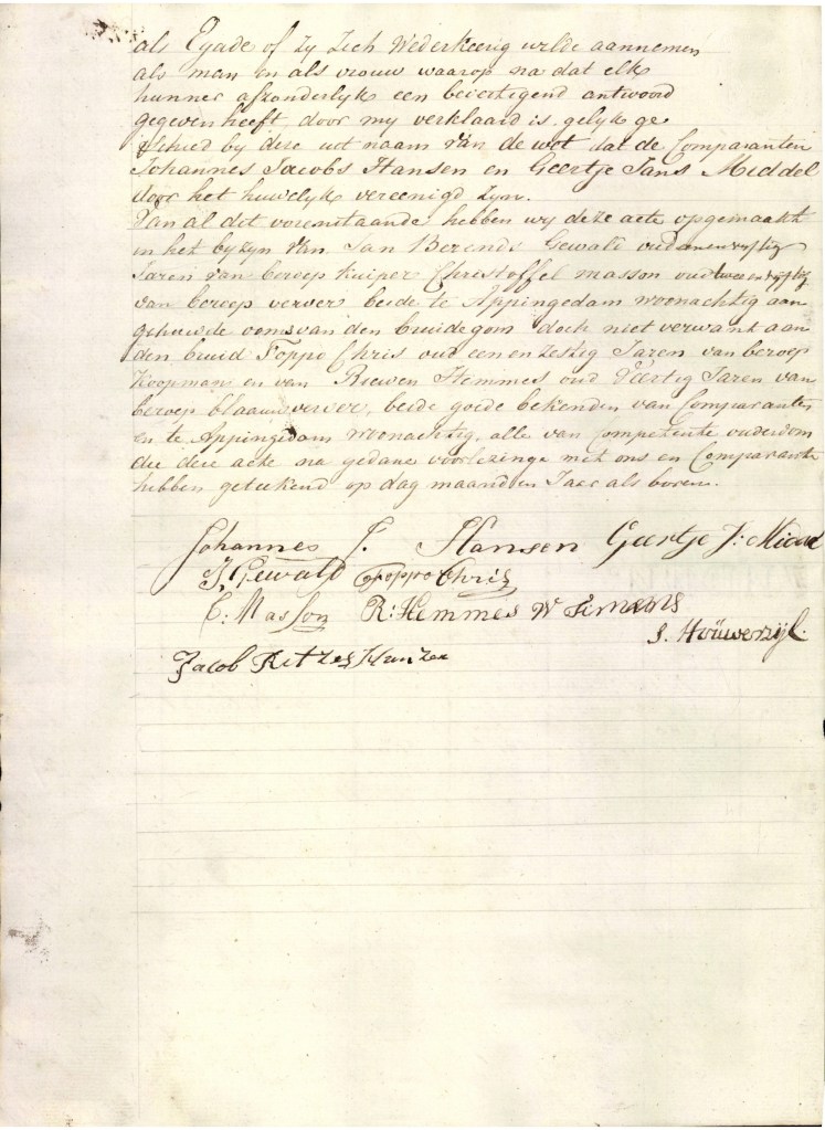 Op 21 januari 1829 stapten in Appingedam, Groningen, Johannes Jacobs Hansen, verver zoon van Jacob Ritzes Hansen (schipper) en Annechien Arnoldus Masson, en Geertje Jans Middel, dochter van Jan Jans Middel (schipper) en Wietske Tiemens de Jonge, in het huwelijksbootje.