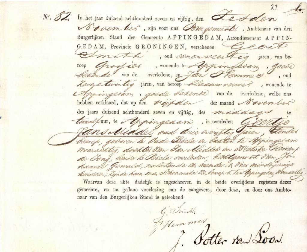Geertje Jans Middel overlijdt, 53 jaar oud, op 5 november 1857 te Appingedam.