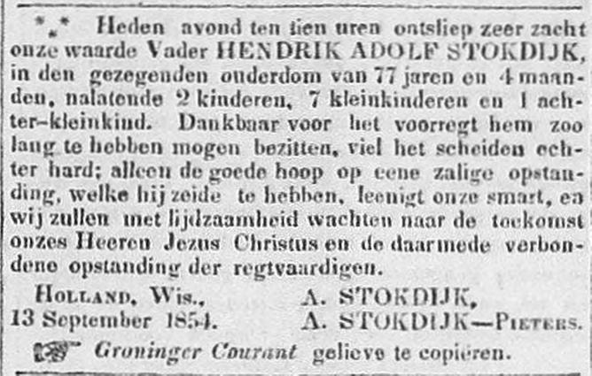 Op 13 september 1854 overleed Hendrik Adolf in Holland WI op de gezegende leeftijd van 77 jaar, na een bewogen leven.