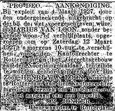 In 1927 plaatst Henri van Loon, de oudste zoon van Marius, een advertentie in de krant, omdat hij wil huwen en toestemming van zijn vader nodig heeft.