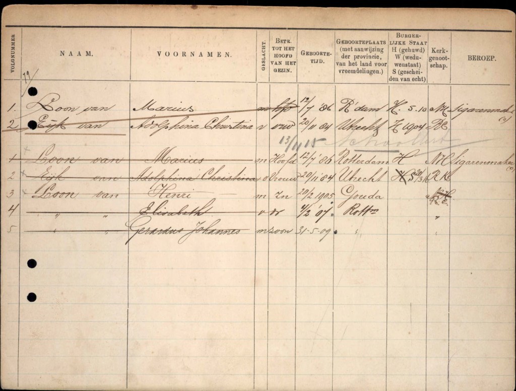 Ook Marius was een sigarenmaker. Hij is getrouwd geweest met Adophina Christina van Eijk van 5 oktober 1904 tot 20 maart 1916.