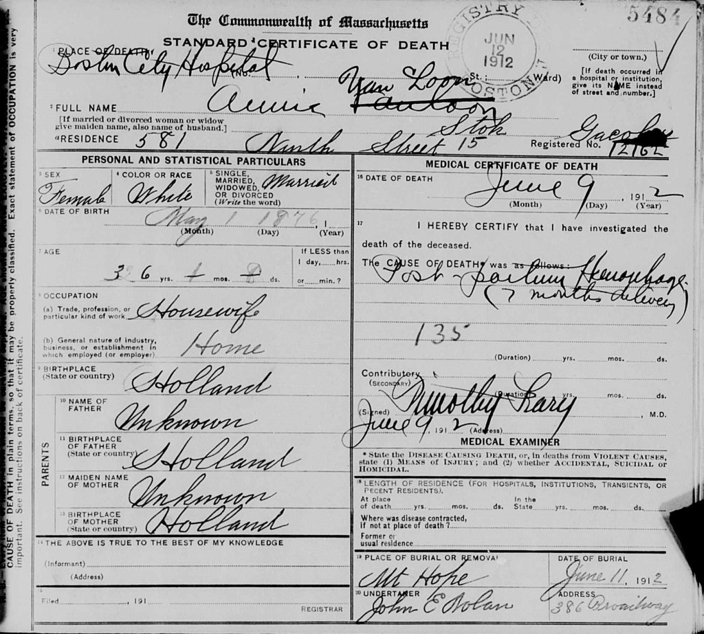Anna Maria overleed een jaar eerder, op 9 juni 1912 in Boston blies ze haar laatste adem uit (“7 months delivery”). Ze is op dezelfde begraafplaats te ruste gelegd.